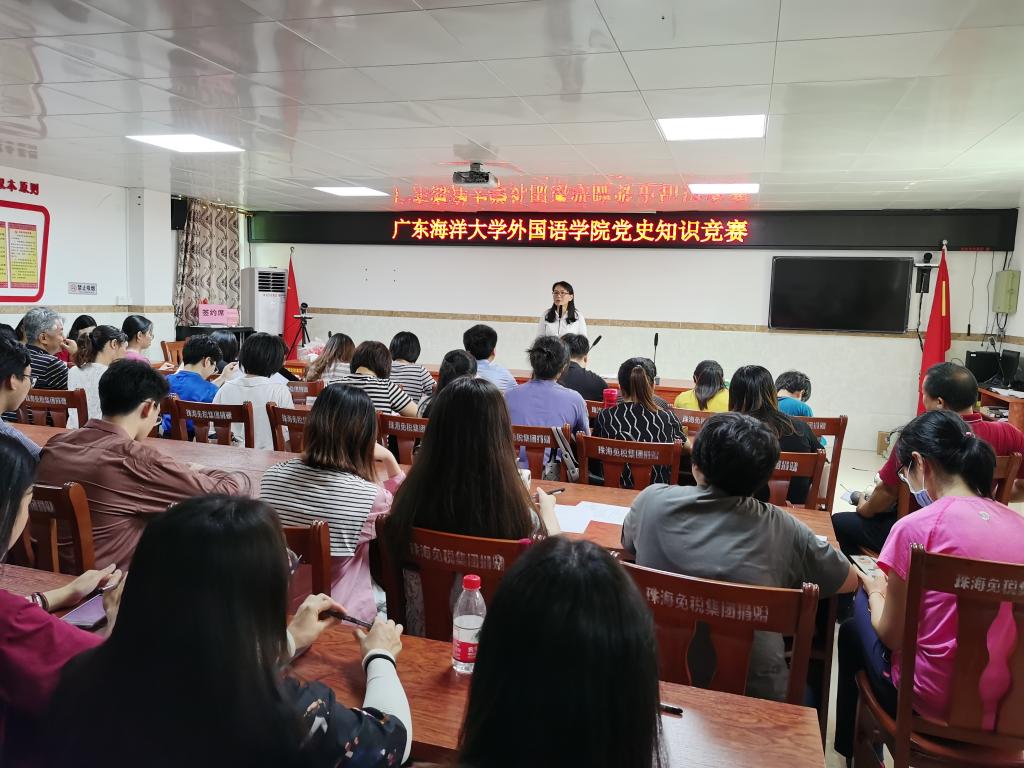 党史知识竞赛活动以党支部为单位,每支队伍由党支部书记带领4名正式党员共5名队员组成。竞赛分为必答和抢答两部分,均为现场作答,旨在考察党员们对党的历史、党的方针政策及党建知识等内容的理解和掌握程度。在比赛时长的限制下,各参赛队员凭借扎实的党史知识基础、认真的复习准备,争先恐后、积极应答。即使在抢答环节,主持人将选择题改为填空题后,难度系数大幅提升,依然也难不倒各参赛队伍,他们团结一心,互不相让,比赛得分追咬紧密,现场气氛紧张刺激。经过一番激烈角逐,最终,员工党支部夺得第一名,日语系教工党支部获得第二名。比赛中,各参赛支部的其他成员变身“智囊团”,积极为各自支部队员出谋划策,参与答题互动,现场气氛高涨。除了代表队成员外,其它党员和入党积极分子也全部参与了必答环节的比赛,得分前八名的党员也给予奖励。