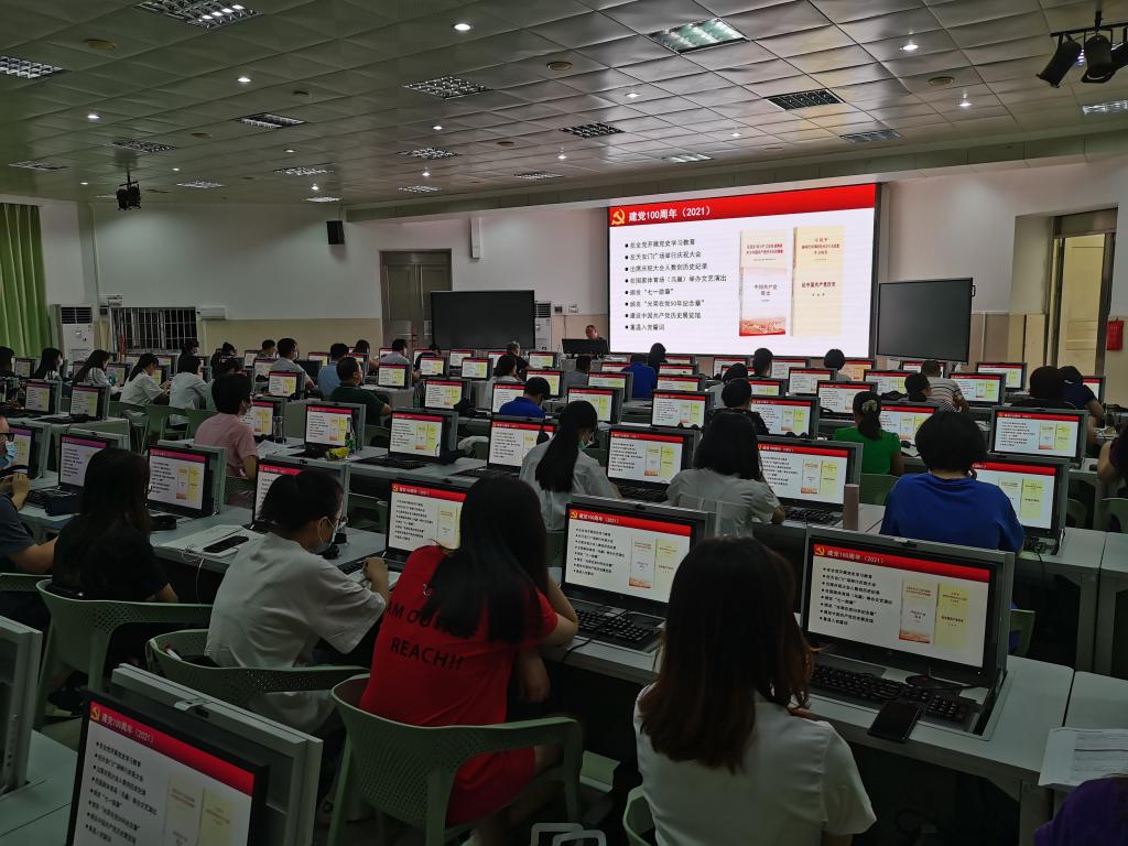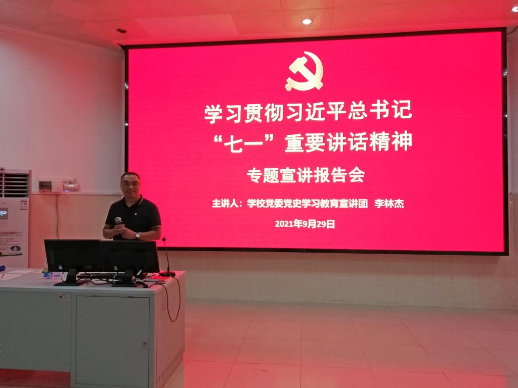9月29日,太阳成集团tyc33455cc在湖光校区兴教楼110室举行学习贯彻习近平总书记“七一”重要讲话精神专题宣讲报告会暨网上参观革命纪念馆,公司党委党史学习教育宣讲团成员李林杰博士作专题宣讲,会议由公司党委副书记、经理郭遂红主持,全体教职工党员、员工党员、副科级以上干部共80多人参加。