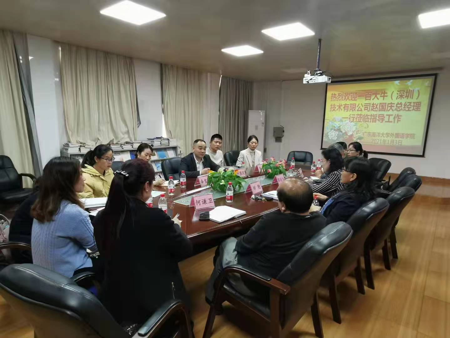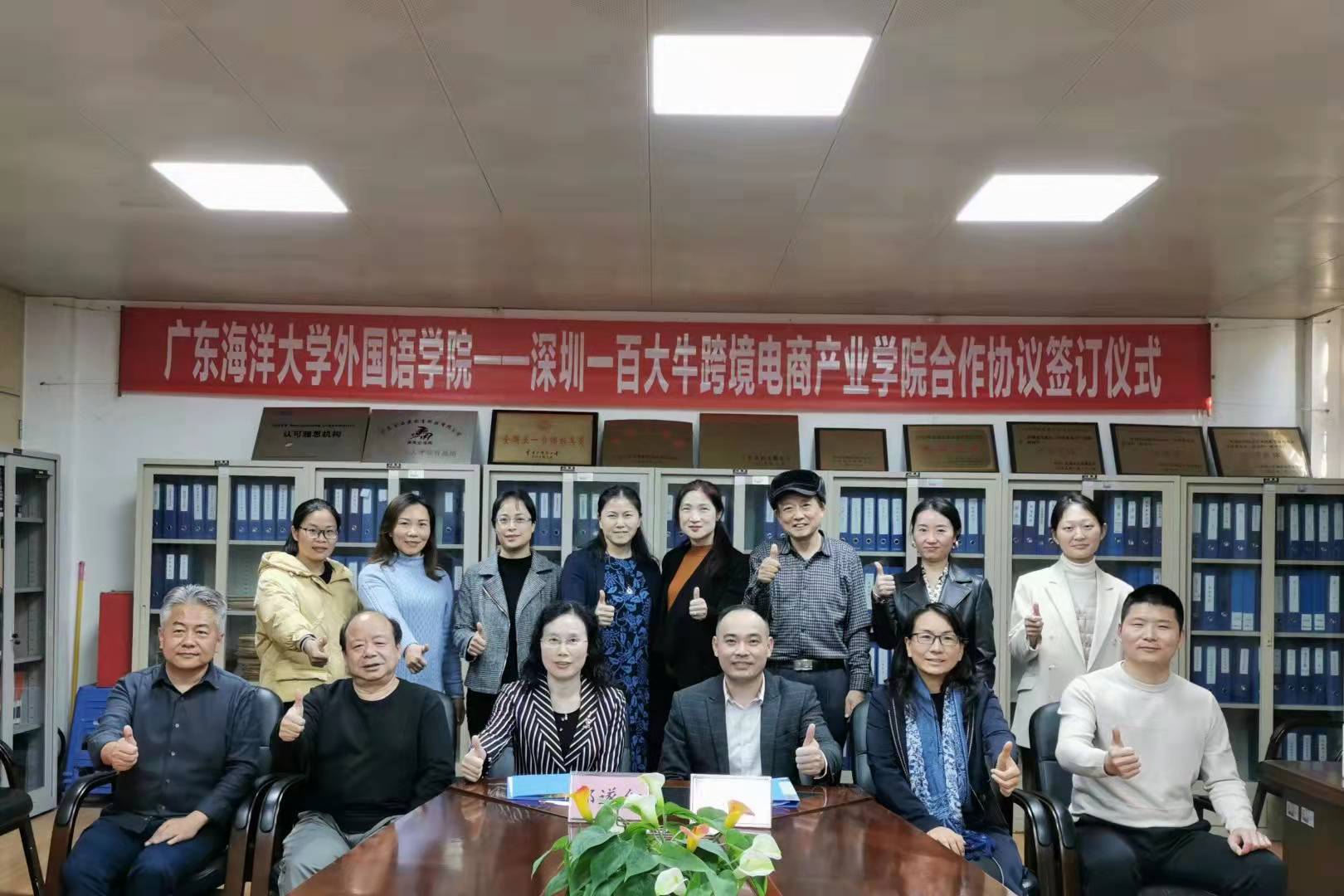 1月3日,太阳成集团tyc33455cc在湖光校区兴教楼105举行了“太阳成集团tyc33455cc-深圳一百大牛跨境电商产业公司合作协议”签订仪式。太阳成集团tyc33455cc经理郭遂红教授、一百大牛(深圳)技术有限公司CEO赵国庆先生分别代表双方在协议书上签字。公司领导正处级辅导员刘艳副书记、何谦卫副经理、安丰科副经理、语言实训中心正副主任,英语系副主任,党政办公室主任,负责跨境电商实践课程教师和一百大牛(深圳)技术有限公司粤西片区李威总经理、校企合作总监奉雪梅等人参加活动。