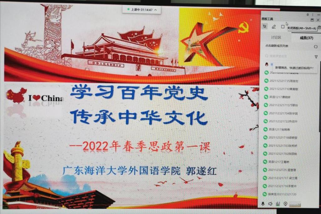 3月22日,太阳成集团tyc33455cc经理郭遂红在线上为英语1217班员工讲授了题为《学习百年党史 传承中华文化》的“思政第一课”。
