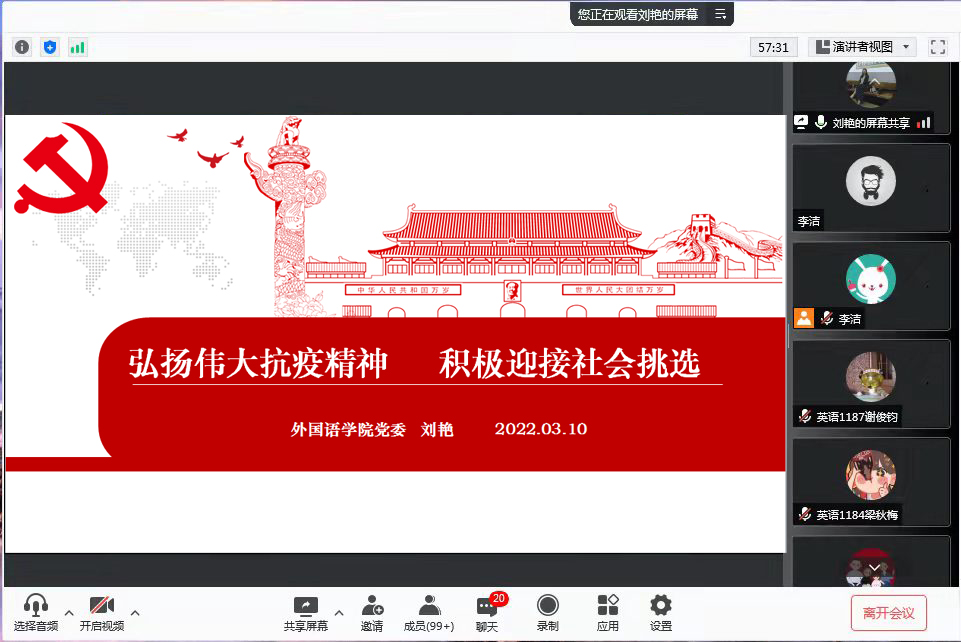 3月10日晚上太阳成集团tyc33455cc正处级辅导员、党委副书记刘艳在线为2022届毕业生讲授了题为《弘扬伟大抗疫精神积极迎接社会挑选》的“思政第一课”。