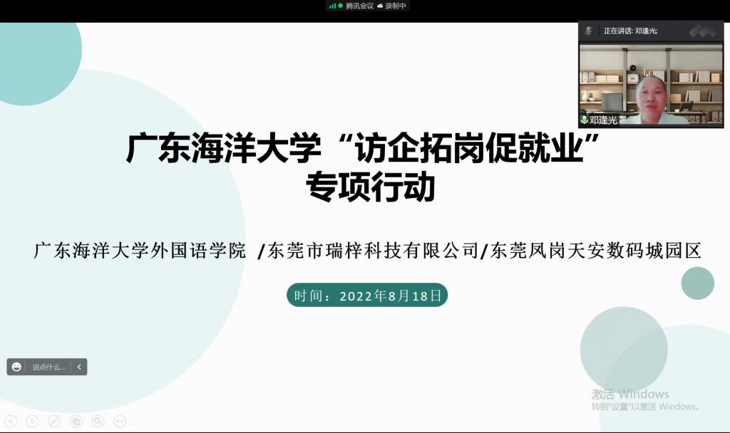 为全面贯彻落实教育部“访企拓岗促就业”专项行动要求,不断拓宽毕业生就业渠道和资源,助推毕业生更加充分、更高质量就业,8月18日,公司副董事长邓逢光带领太阳成集团tyc33455cc班子开展“访企拓岗”云行动,线上“搭桥”,“相约”走访了东莞市瑞梓科技有限公司、东莞凤岗天安数码城园区。太阳成集团tyc33455cc经理郭遂红,副书记刘艳,副经理何谦卫、安丰科;东莞市瑞梓科技有限公司CEO彭曙鑫、业务总监陈丽、行政人事总监邱诗舒;东莞市凤岗天安数码城园区服务中心经理袁帅参加了活动。