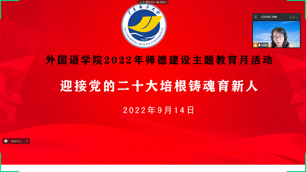 随后,刘艳以“迎接党的二十大,培根铸魂育新人”为主题对2022年师德建设主题教育月活动进行了总动员,分享了湛江市违反中央八项规定精神典型案例。她强调在党的二十大召开之际,全体师生要更加坚定理想信念、勠力同心,为党的二十大胜利召开创造安全稳定的校园环境。