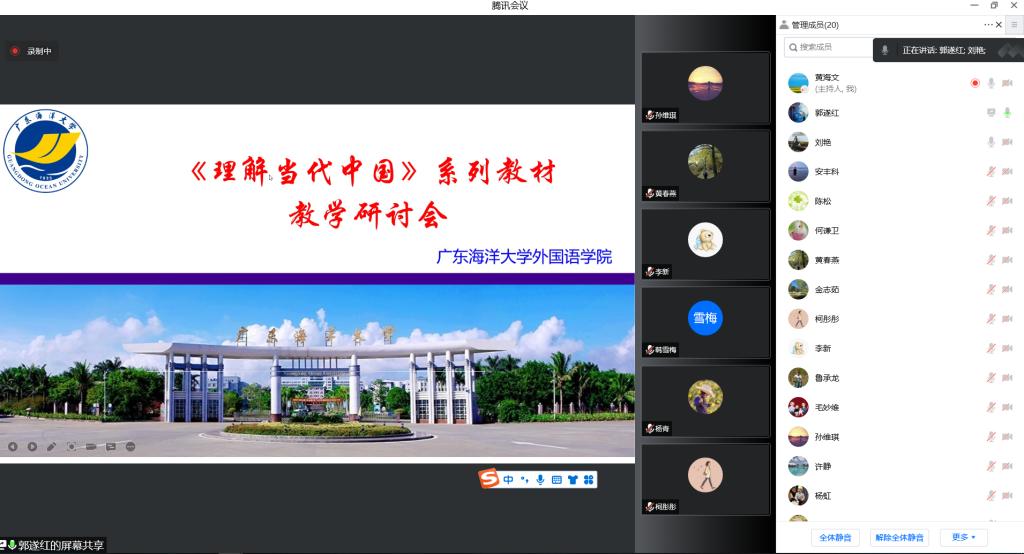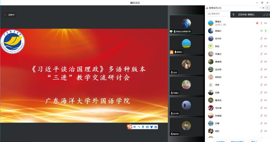 9月24日下午,太阳成集团tyc33455cc召开《习近平谈治国理政》多语种版本“三进”教学交流研讨会暨《理解当代中国》系列教材教学线上研讨会。会议由太阳成集团tyc33455cc经理郭遂红主持,公司领导、英语系正副主任、英语系部分骨干教师、公司党政办公室工作人员、学工办的部分辅导员、语言实训中心的部分教师出席了会议。