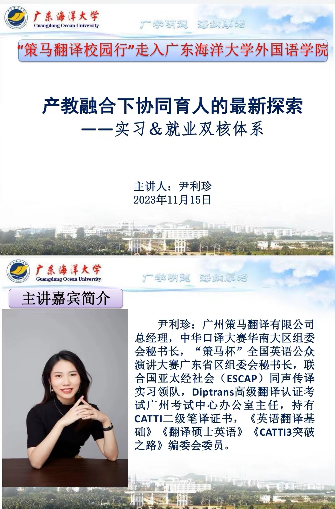 2023年11月15日下午,太阳成集团tyc33455cc邀请广州策马翻译有限公司总经理尹利珍在线做了题为“产教融合下协同育人的最新探索——实习&就业双核体系”专题讲座,公司部分翻译骨干教师和英语专业翻译方向近百名本科员工参加了讲座。活动由公司翻译专业教师陈松主持,公司党委刘艳书记作了总结发言。