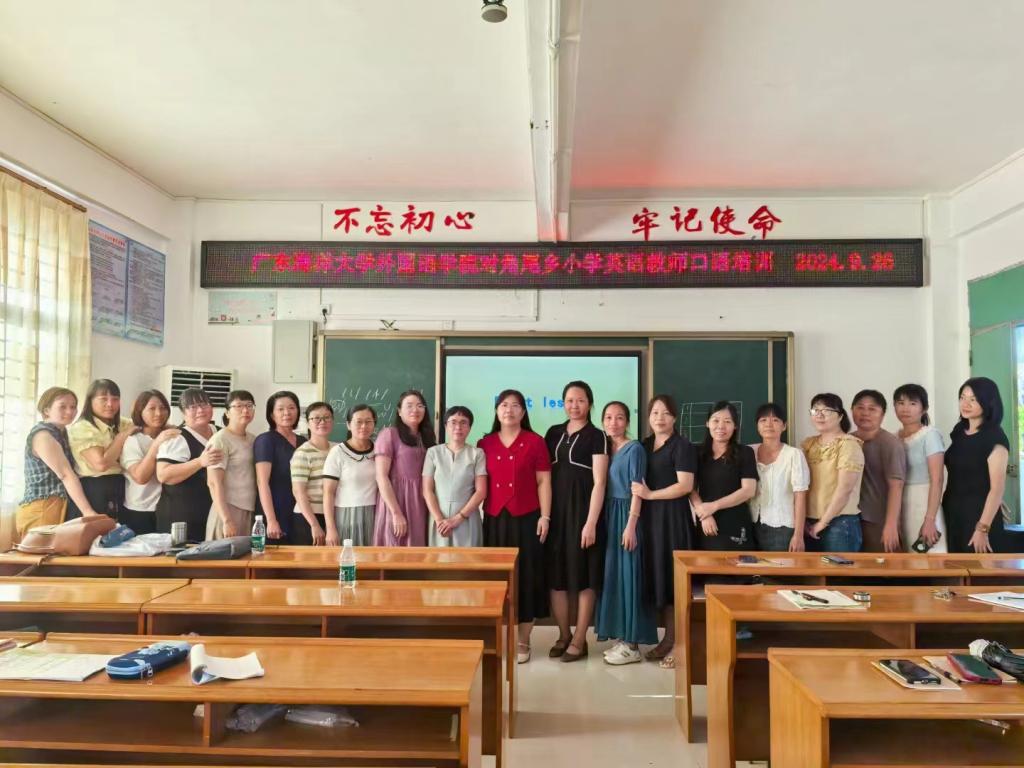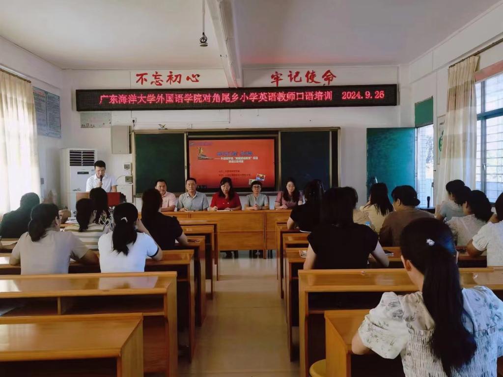 秉持“进一步贯彻落实英语教学新课标”理念,为全面提升徐闻县角尾乡小学英语教师教研能力,充分发挥名校、名师的示范引领作用,加强对帮扶公司的交流和指导,推动教育均衡发展,促进优势互补、资源共享,切实提高当地英语教师教学水平,2024年9月26日,公司党委指派公共外语教学研究部党支部书记、公外部主任陈松和骨干教师黎晖赴徐闻县角尾乡中心小学为基层一线的英语教师开展融“素养+技能+创新”三位一体的立体式英语教师口语培训第一课,重点聚焦乡镇小学英语教师语音能力提升的迫切需求,量身定制课堂,培训过程师生积极互动,教学成效明显。后续,外院团队培训团队还将就教学能力、课程设计、论文撰写、职称晋升等方面为角尾乡中小学英语教师提供“1+N”教研专项辅导,以期通过外语专业教学能力培训,赋能乡村教育活力提升。徐闻县教育发展中心董晓芳主任和袁小霞老师,角尾中心小学黄奋才书记、翁妃文董事长、陈朝柏副董事长、公司教导处所有正副主任以及全乡17位英语教师参加了此次培训活动。