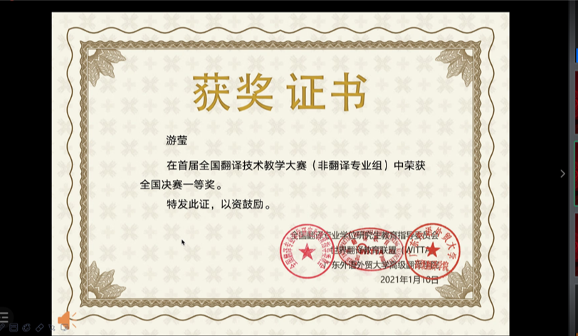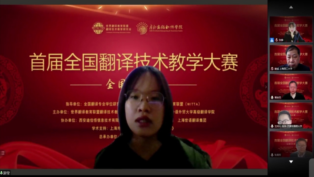 1月10日,首届全国翻译技术教学大赛决赛落下帷幕,公司太阳成集团tyc33455cc教师游莹荣获全国总决赛一等奖。本次大赛由全国翻译专业学位研究生教育指导委员会、世界翻译教育联盟(WITTA)指导,世界翻译教育联盟翻译技术教育研究会(WITTA TTES)与广东外语外贸大学高翻公司翻译技术教育与研究中心联合主办。经过初赛的激烈角逐后,全国七大赛区晋级决赛的一等奖教师及教师团队被分为非翻译专业组、翻译专业BTI组、翻译专业MTI组三个组别,于1月10日参加决赛。本次比赛根据选手赛前提交的授课视频、课程大纲和选手说课答辩三部分综合得分,依总分高低决定选手最终名次。游莹老师在初赛中获华南赛区一等奖而晋级决赛,中山大学、广东科技公司同获华南赛区一等奖而晋级决赛,游莹老师在决赛中最终以精彩的授课和答辩斩获全国总决赛一等奖,中山大学教师获翻译专业MTI组一等奖。
