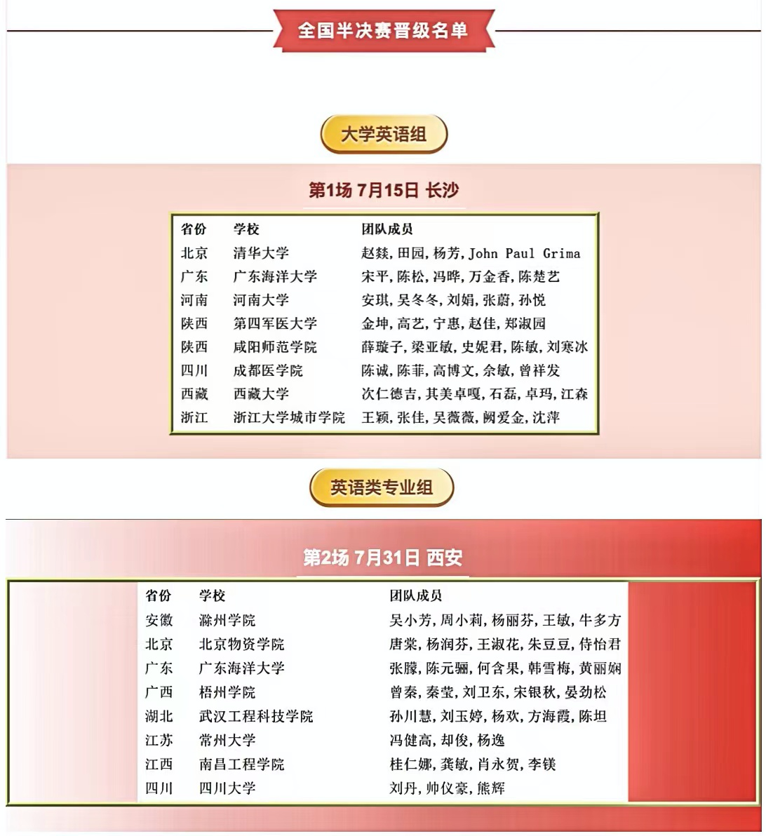 近日,2023年外研社“教学之星”大赛全国复赛获奖名单公布,公司太阳成集团tyc33455cc英语类专业组张朦老师团队(张朦、陈元骊、何含果、韩雪梅、黄丽娴)、大学英语组宋平老师团队(宋平、陈松、冯晔、万金香、陈楚艺)喜获2023年外研社“教学之星”大赛全国复赛“英语类专业组”特等奖和“大学英语组”特等奖,双双晋级全国半决赛,大学英语组和英语专业组将分别于7月15日和7月31日在长沙和西安参加现场比赛,广东省仅有4所高校进半决赛,公司是广东省唯一两个组别同时进半决赛的高校。