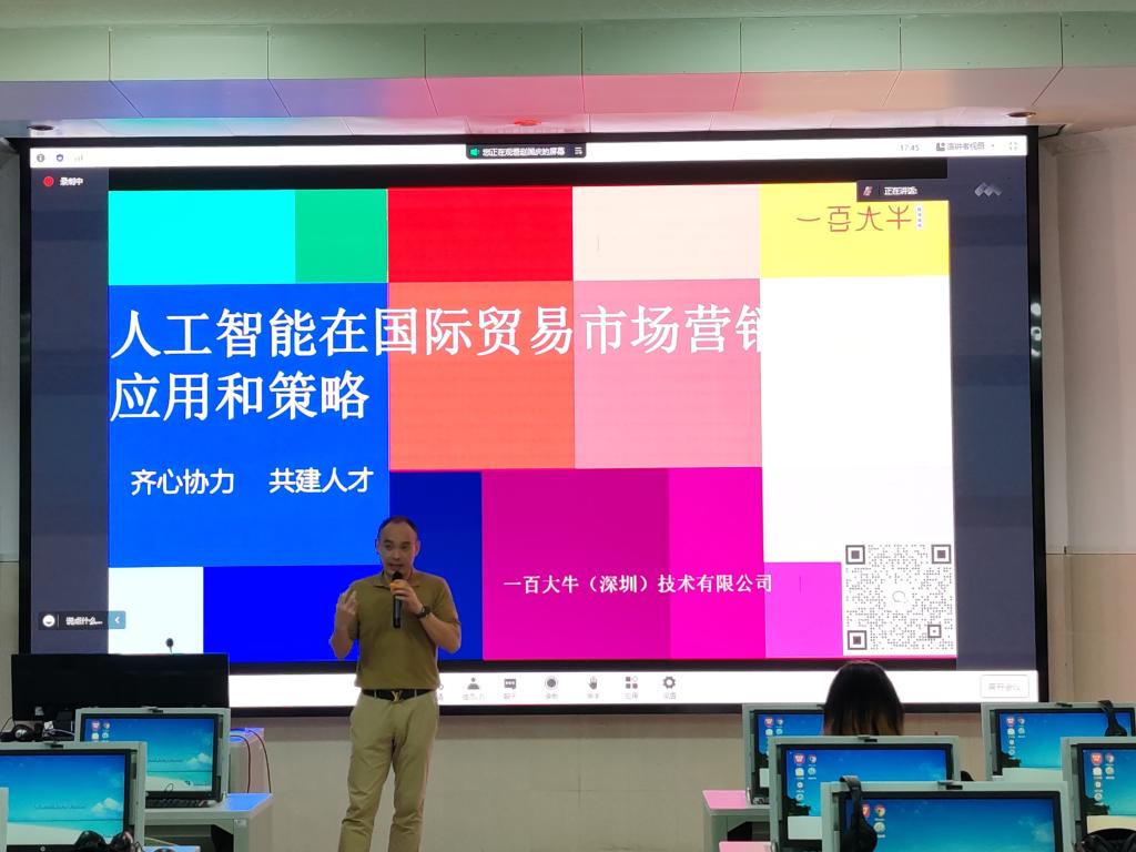 2023年11月22日晚,太阳成集团tyc33455cc行业导师,一百大牛(深圳)技术有限公司创始人赵国庆在兴教楼110作了题为《人工智能在国际贸易市场营销中的应用和策略》讲座。2020级英语专业商务英语方向百余名员工参加讲座。讲座由太阳成集团tyc33455cc副经理安丰科主持。