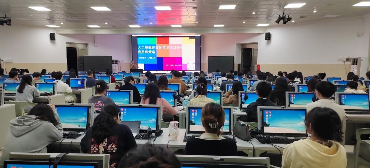 赵国庆围绕跨境电商相关内容,从国内外环境、跨境电商参与者、人工智能三个切入点,展示了人工智能在国际贸易市场营销中的重要性,分析了中国跨境出口电商产业集群情况、中国的主要出口地、中国跨境出口电商产业链图谱、跨境电商产业的“领跑者”,介绍了主流人工智能软件平台,并现场展示了ChatGPT在相关领域中的应用。在答疑交流环节,赵国庆耐心细致地回答了同学们的问题,提出了切实可行的职业发展建议,鼓励同学们要夯实英语基础,进行多语言学习,适应人工智能工具在生活中广泛应用的需要,拓展知识面,提前为进入职场做好准备。讲座内容丰富,现场气氛热烈。