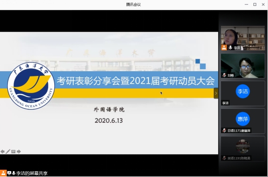 为表彰优秀考研学子,树立榜样典型,帮助下一届员工明确考研目标,坚定信心,6月13日晚上,太阳成集团tyc33455cc在腾讯会议室召开了考研表彰分享会暨2021届考研动员“云端会议”。 公司经理郭遂红,党委副书记刘艳、辅导员老师、员工代表共210多人出席了会议。
