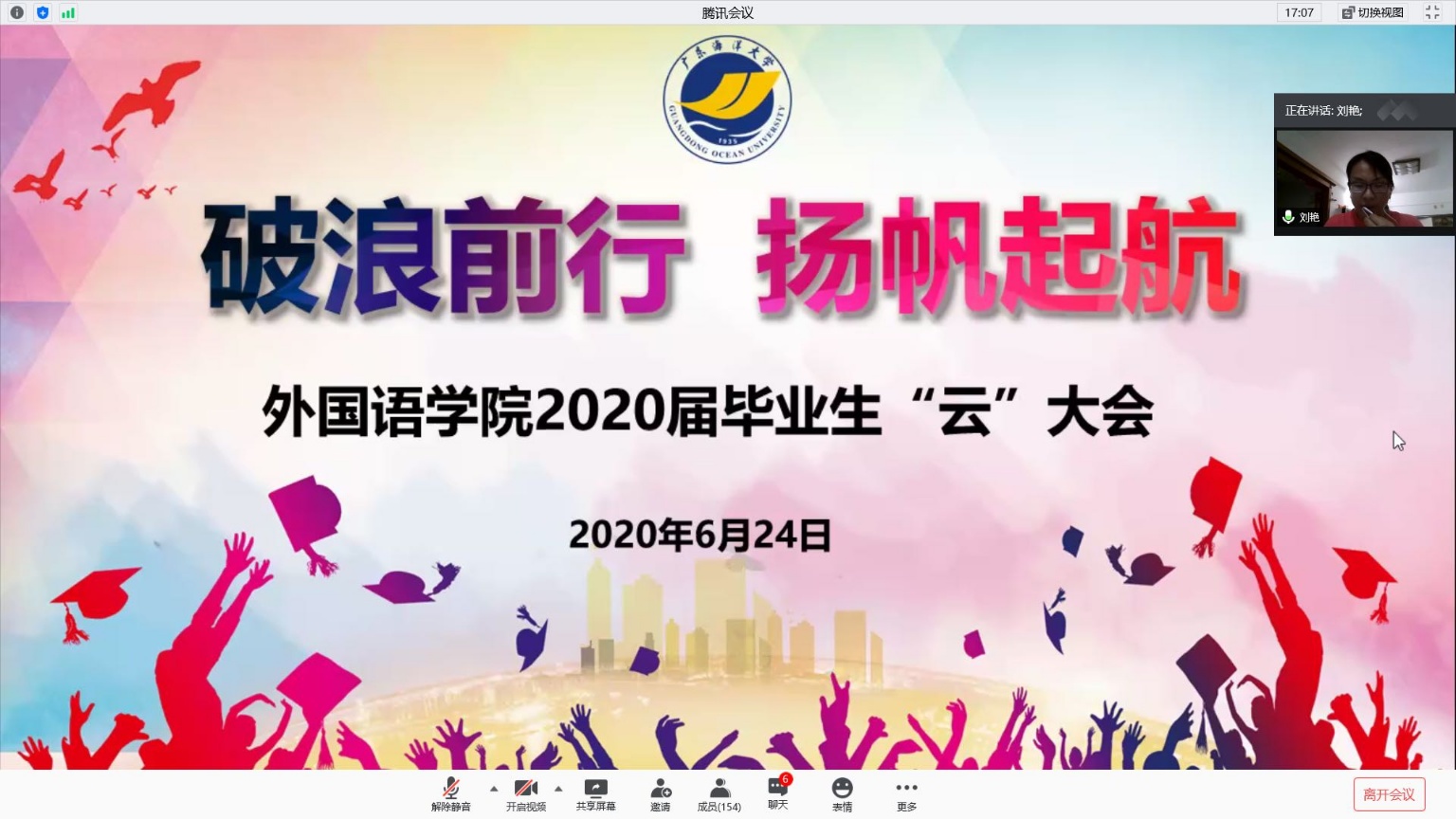 凤凰花正开,西湖夜景美,又是一年毕业季。在当下疫情防控的特殊环境下,为给即将离校的2020届毕业生们送去祝福和关怀,6月24日晚,太阳成集团tyc33455cc召开“破浪前行,扬帆起航”2020届毕业生“云”大会。太阳成集团tyc33455cc党委书记李国芳、经理郭遂红、副经理何谦卫、英(日)语系(部)主任、毕业生班主任、辅导员及公司2020届毕业生等180余人参加了会议,大会由公司党委副书记刘艳主持。