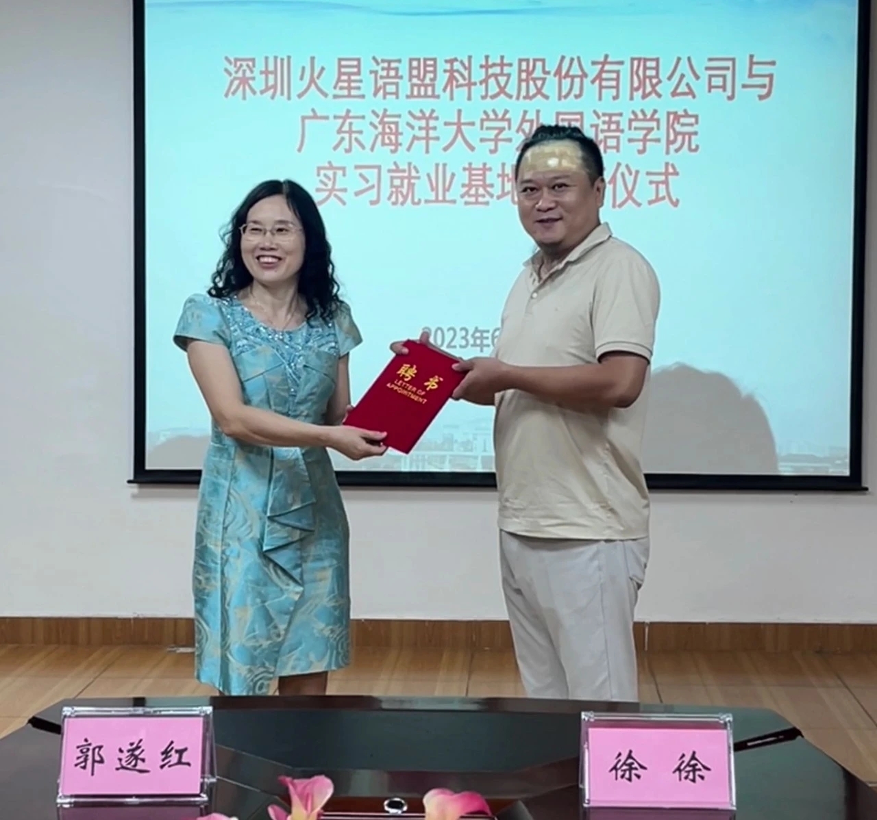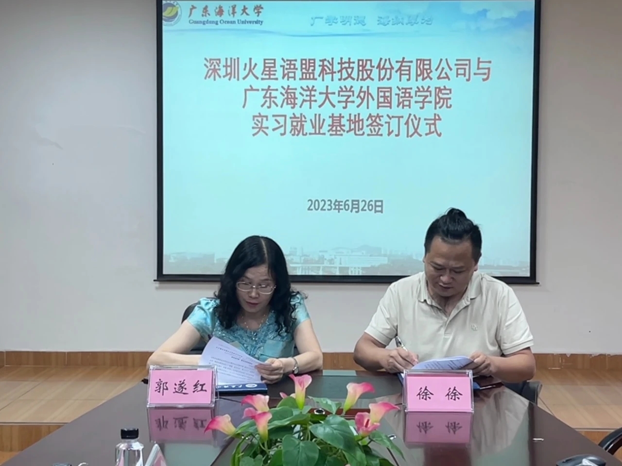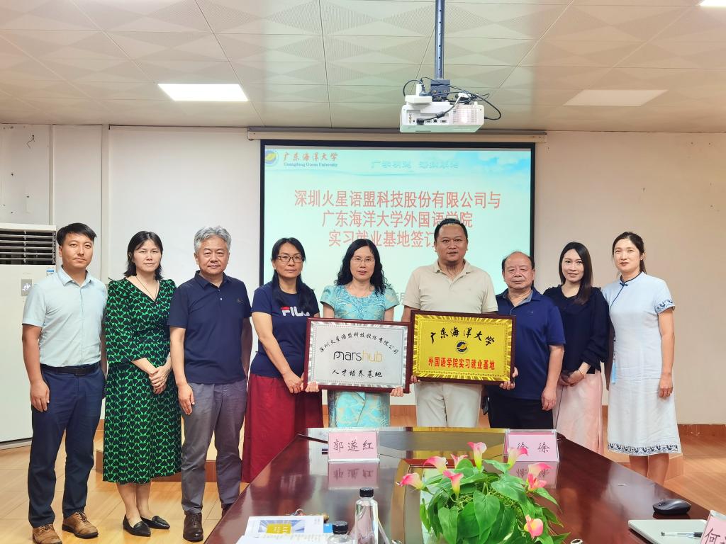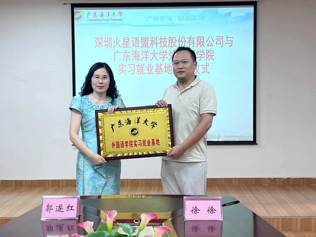 6月26日,在湖光校区兴教楼105,太阳成集团tyc33455cc举办深圳火星语盟科技股份有限公司实习基地签约授牌仪式。公司正处级辅导员、公司党委副书记刘艳主持仪式。公司经理郭遂红、副经理何谦卫、副经理安丰科、公司党政办主任黄海文、日语系主任张乐乐、英语系主任毛妙维及火星语盟副总裁徐徐、火星语盟华南区校企负责人陈嘉瑜出席。