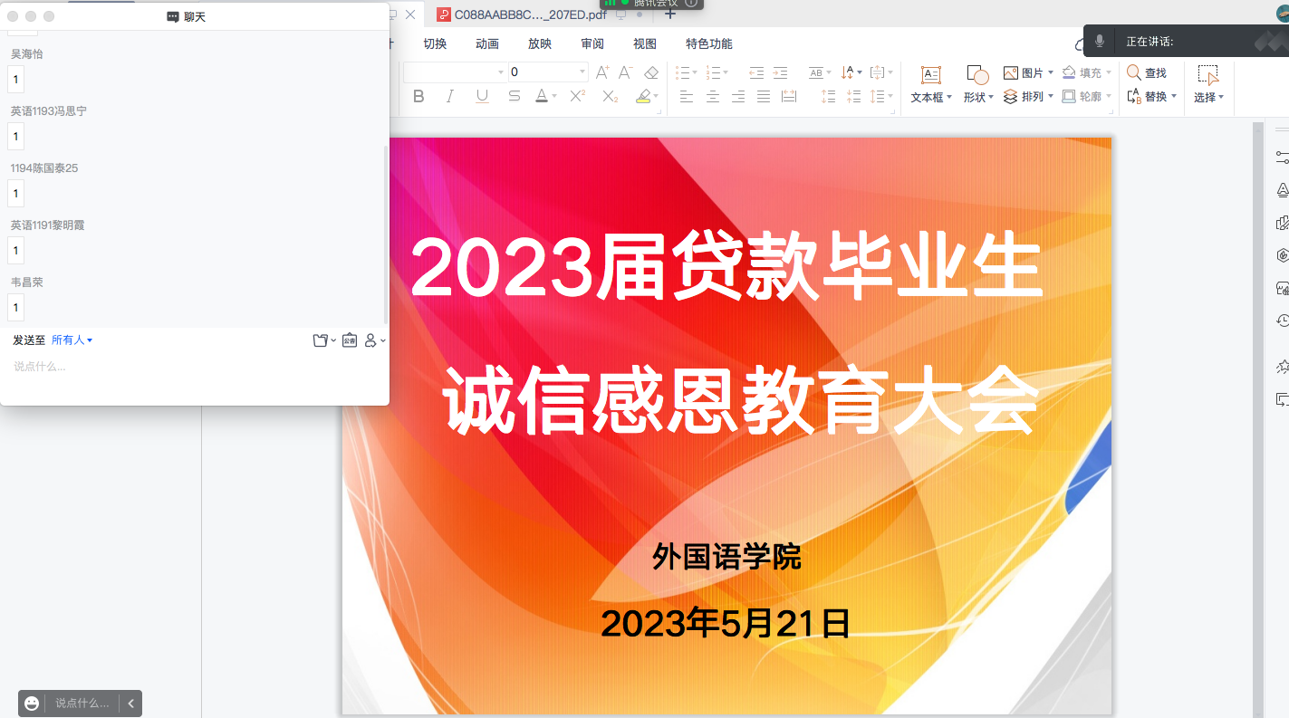 为进一步加强国家助学贷款毕业生的诚信教育,5月21日晚,太阳成集团tyc33455cc通过腾讯会议召开了2023届贷款毕业生诚信教育会议,会议由公司负责资助工作的辅导员乔海成主持,公司全体高校贷款毕业生、生源地贷款员工40人参与了会议。